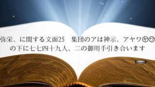 マンデラ・エフェクト文面(2025年6月24日~ 弥栄、に関する文面25 集団のアは神示、アヤワ㋳㋻の下に七七四十九人、二の御用手引き合います 弥栄、に関する文面25に進みます。今回は、〇つりの巻(マツリの巻)の文面2つです。1つの文面は、第十五帖、旧九月八日から当分の礼拝に仕方ついての文面ですが、こちらは、変化がないと見てゐます。ですが、覚悟が決まった方は、旧九月八日から礼拝を始... 2025.09.23 マンデラ・エフェクト文面(2025年6月24日~
