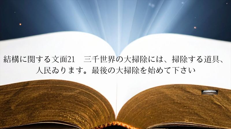 1.碧玉之巻 第十三帖 三千世界の大掃除ですから、掃除するには、掃除する道具もゐります。人民もゐります。今の有様では、いつ迄たっても掃除はできず、益々けがれるばかりです。