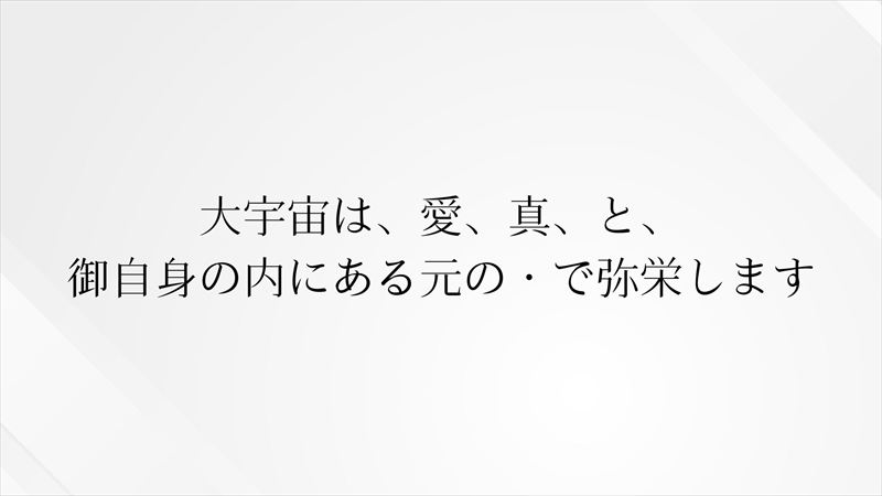 Ⅰ.宇宙とは、真と愛との現れです。愛と真が善と智と現はれ、喜びとなってはたらき、・が加わって弥栄えた生命です。