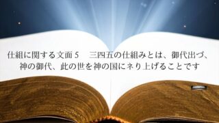 335.仕組に関する文面5 三四五の仕組みとは、御代出づ、神の御代、此の世を神の国にネり上げることです
