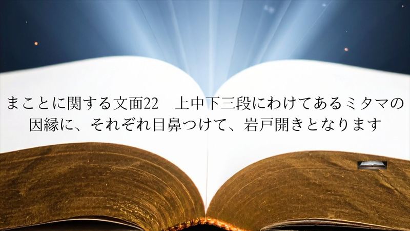 まことに関する文面22 上中下三段にわけてあるミタマの因縁に、それぞれ目鼻つけて、岩戸開きとなります
