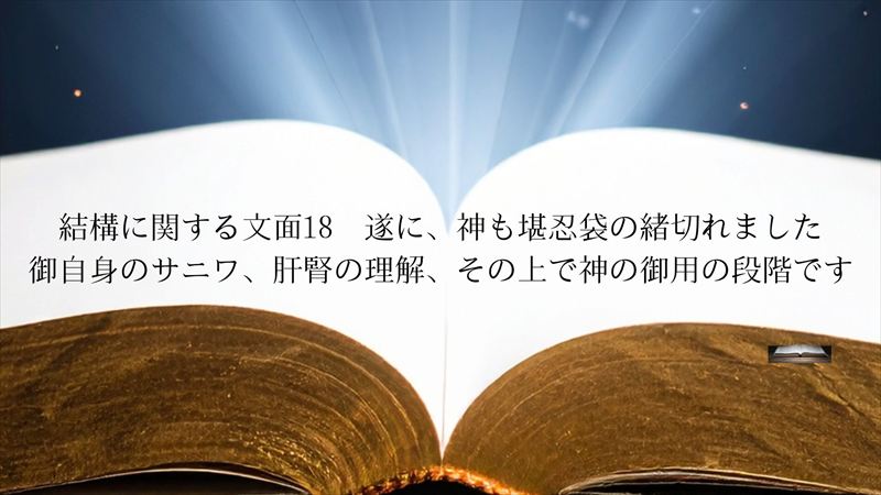 結構に関する文面18 遂に、神も堪忍袋の緒切れました。御自身のサニワ、肝腎の理解、その上で神の御用の段階です