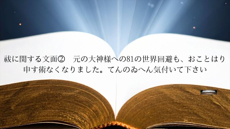 1.天つ巻 第十三帖 神は元の大神様に延ばせるだけ延ばして頂いてますが、もうおことはり申す術(すべ)なくなった段階です。てんのゐへん気つけて下さい。神世が近づいて居ます。