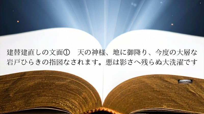 建替建直しの文面① 天の神様、地に御降り、今度の大層な岩戸ひらきの指図なされます。悪は影さへ残らぬ大洗濯です