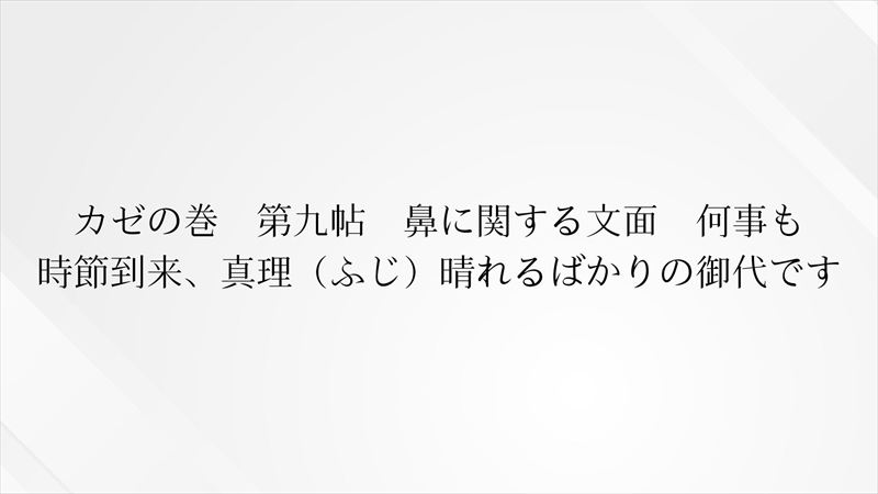 - 1.カゼの巻 第九帖 鼻に関する文面 何事も時節到来、真理(ふじ)晴れるばかりの御代です